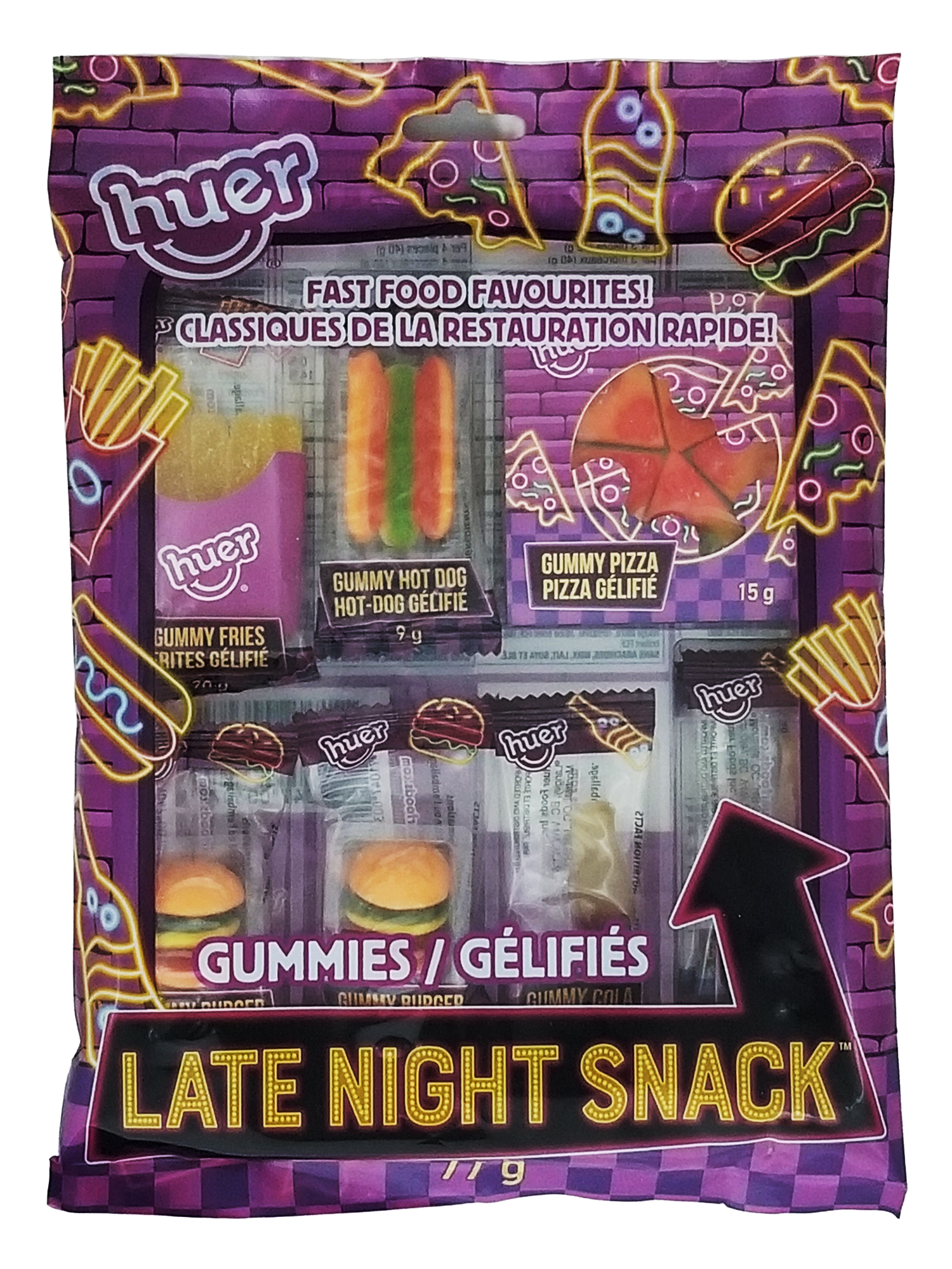 Satisfy your late-night cravings with Huer Fast Food Favorites Gummies! This fun and playful 77g (2.7 oz) bag brings all your favorite fast food treats to life in delicious gummy form—without the guilt.