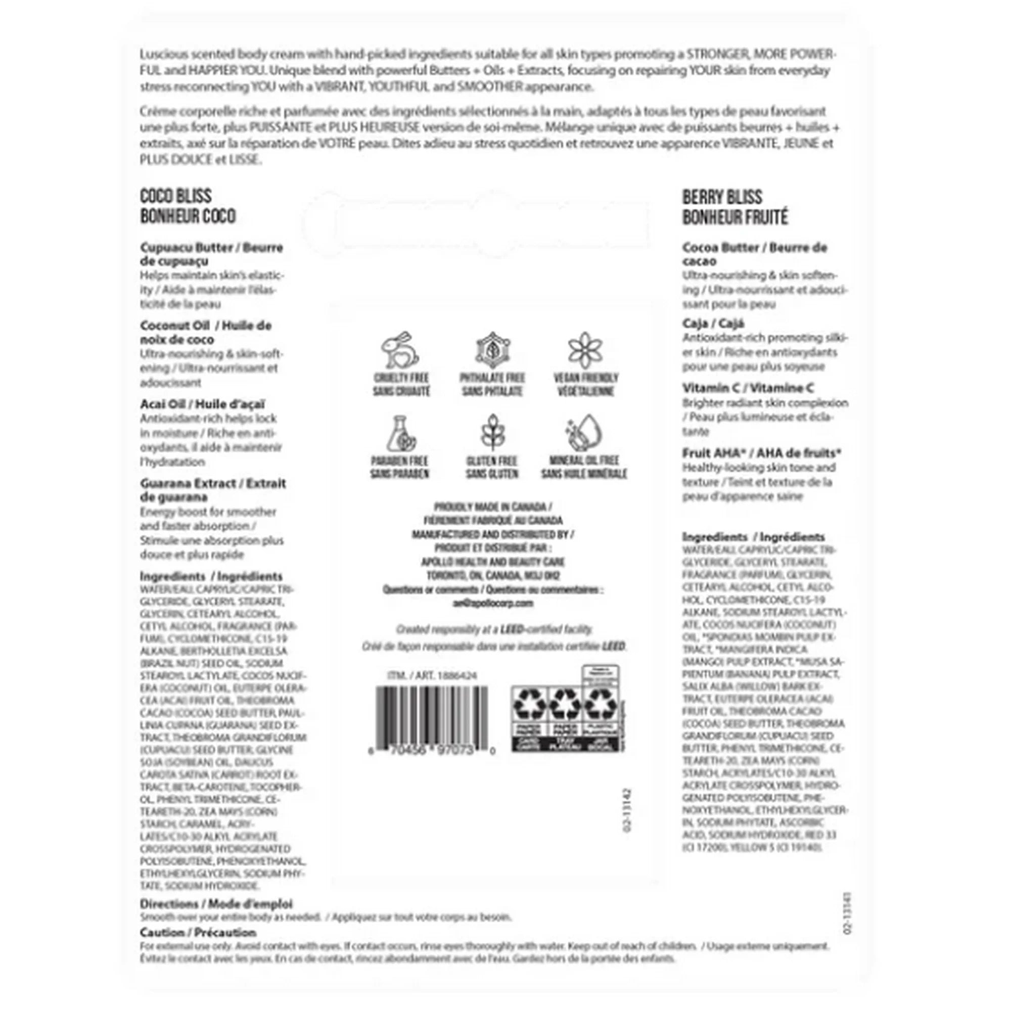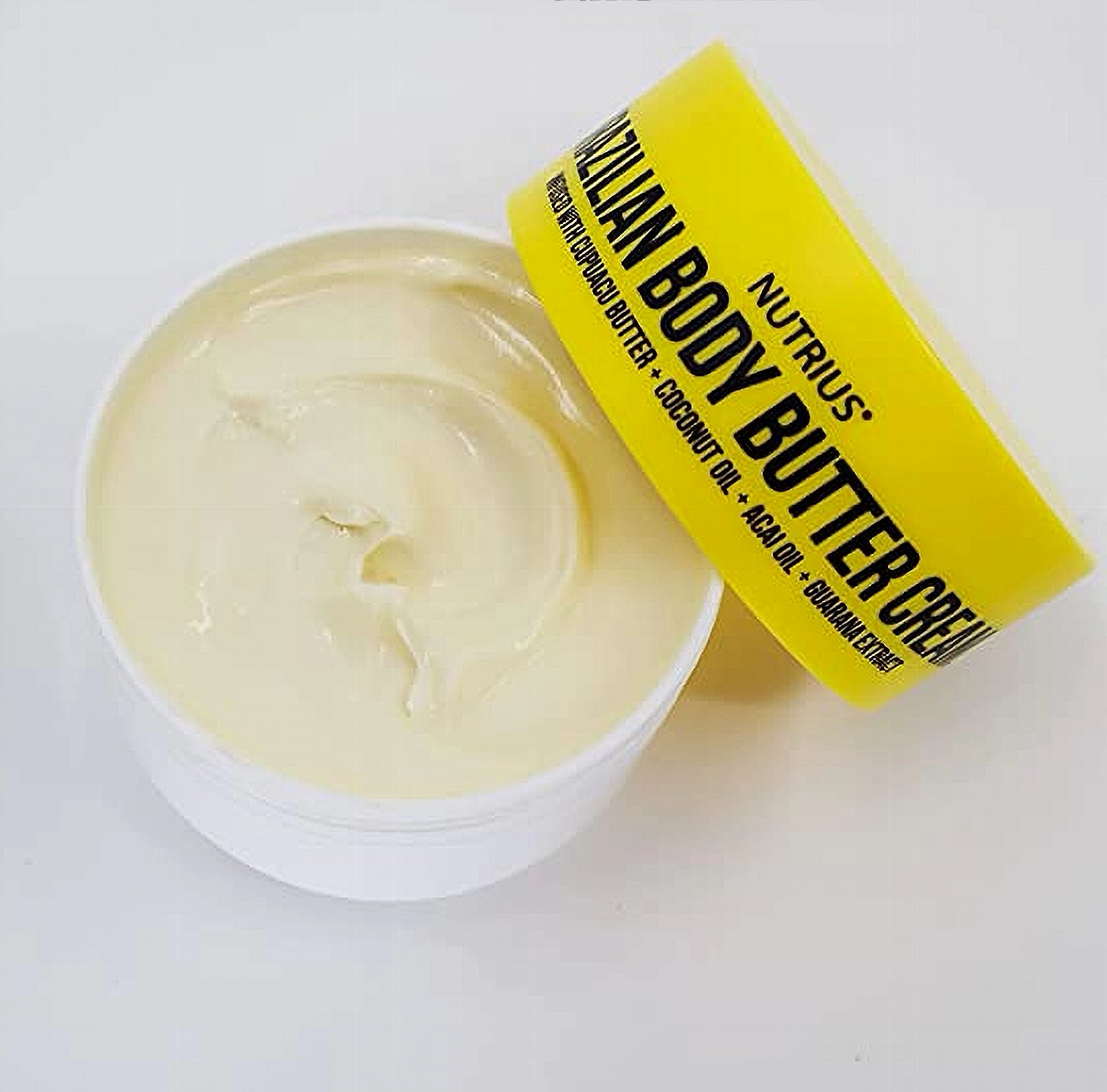 Nutrius Brazilian Body Butter Cream is a vegan, cruelty-free, paraben-free moisturizing body cream infused with Cupuaçu Butter, Coconut Oil, Açaí Oil, and Guaraná Extract — available in Coco Bliss and Berry Bliss scents, in a 2 x 177 mL (6 fl oz) set, made in Canada for all skin types.