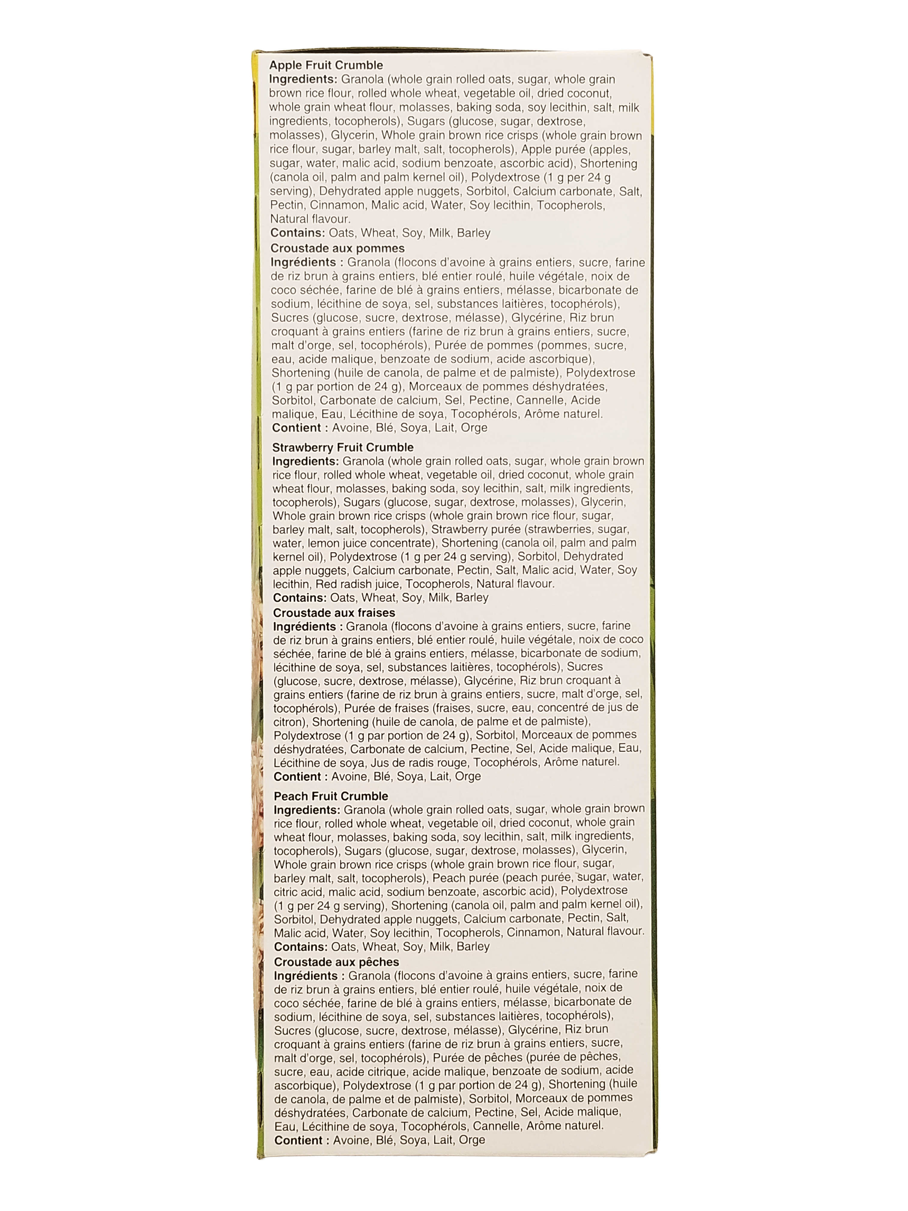 | Ingredients | Apple Fruit Crumble Ingredients: Granola (whole grain rolled oats, sugar, whole grain brown rice flour, rolled whole wheat, vegetable oil, dried coconut, whole grain wheat flour, molasses, baking soda, soy lecithin, salt, milk ingredients, tocopherols), Sugars (glucose, sugar, dextrose, molasses), Glycerin, Whole grain brown rice crisps (whole grain brown rice flour, sugar, barley malt, salt, tocopherols), Apple purée (apples, sugar, water, malic acid, sodium benzoate, ascorbic acid), Shortening (canola oil, palm and palm kernel oil), Polydextrose (1 g per 24 g serving), Dehydrated apple nuggets, Sorbitol, Calcium carbonate, Salt, Pectin, Cinnamon, Malic acid, Water, Soy lecithin, Tocopherols, Natural flavour. Contains: Oats, Wheat, Soy, Milk, Barley Strawberry Fruit Crumble Ingredients: Granola (whole grain rolled oats, sugar, whole grain brown rice flour, rolled whole wheat, vegetable oil, dried coconut, whole grain wheat flour, molasses, baking soda, soy lecithin, salt, milk ingredients, tocopherols), Sugars (glucose, sugar, dextrose, molasses), Glycerin, Whole grain brown rice crisps (whole grain brown rice flour, sugar, barley malt, salt, tocopherols), Strawberry purée (strawberries, sugar, water, lemon juice concentrate), Shortening (canola oil, palm and palm kernel oil), Polydextrose (1 g per 24 g serving), Sorbitol, Dehydrated apple nuggets, Calcium carbonate, Pectin, Salt, Malic acid, Water, Soy lecithin, Red radish juice, Tocopherols, Natural flavour. Contains: Oats, Wheat, Soy, Milk, Barley Peach Fruit Crumble Ingredients: Granola (whole grain rolled oats, sugar, whole grain brown rice flour, rolled whole wheat, vegetable oil, dried coconut, whole grain wheat flour, molasses, baking soda, soy lecithin, salt, milk ingredients, tocopherols), Sugars (glucose, sugar, dextrose, molasses), Glycerin, Whole grain brown rice crisps (whole grain brown rice flour, sugar, barley malt, salt, tocopherols), Peach purée (peach purée, sugar, water, citric acid, malic acid, sodium benzoate, ascorbic acid), Polydextrose (1 g per 24 g serving), Shortening (canola oil, palm and palm kernel oil), Sorbitol, Dehydrated apple nuggets, Calcium carbonate, Pectin, Salt, Malic acid, Water, Soy lecithin, Tocopherols, Cinnamon, Natural flavor |