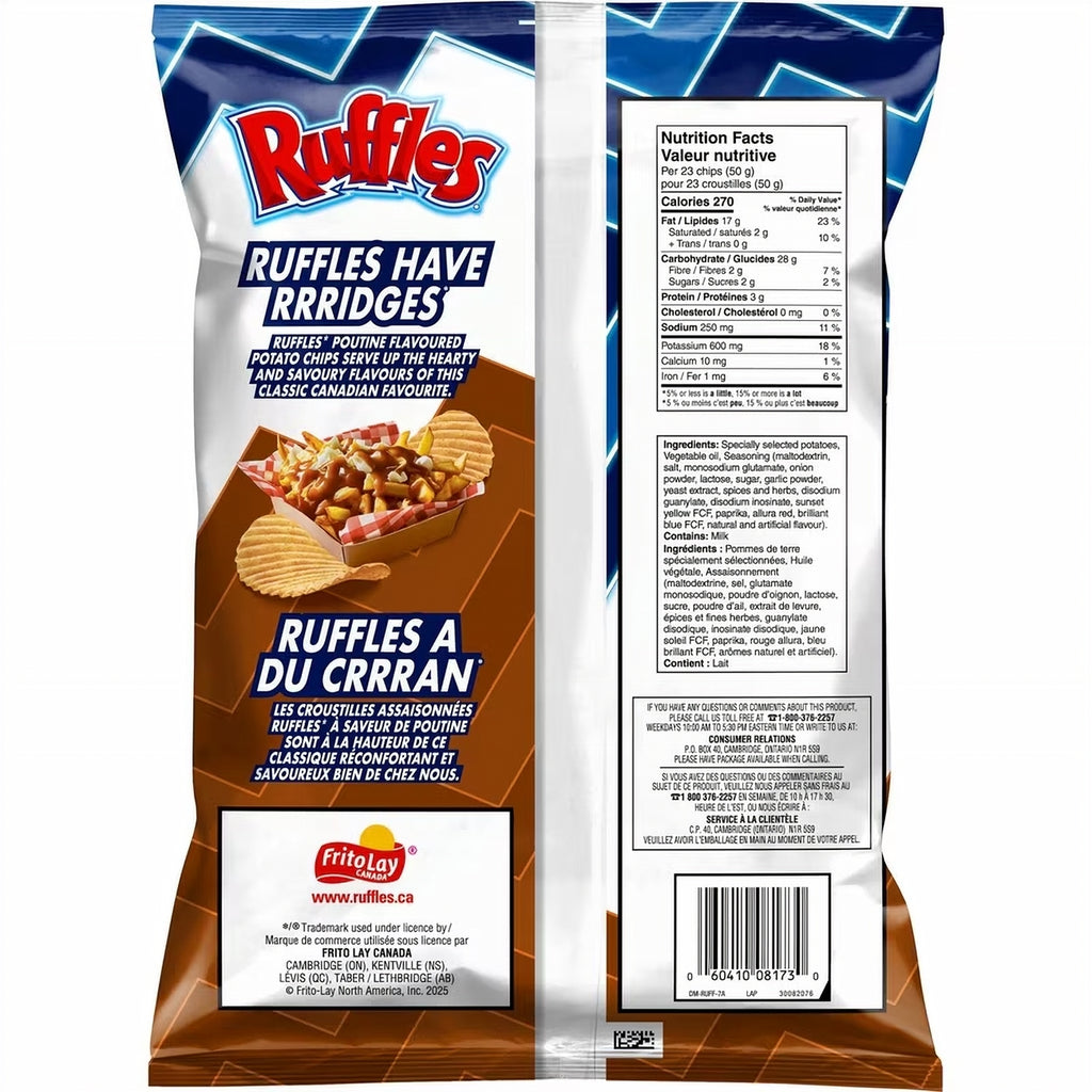 Indulge in the iconic taste of Canada's beloved poutine with Ruffles Poutine Flavored Potato Chips. These ridged chips capture the perfect blend of crispy fries, rich brown gravy, and squeaky cheese curds that make poutine a Canadian classic.