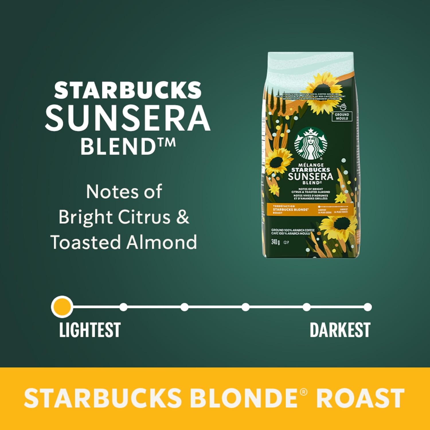 STARBUCKS SUNSERA BLEND blonde roast coffee provides radiant brightness and balance with every sip. Inspired by sun-dried coffee beans, this uniquely smooth blend is lightly roasted to bring out citrus and toasted almond notes.