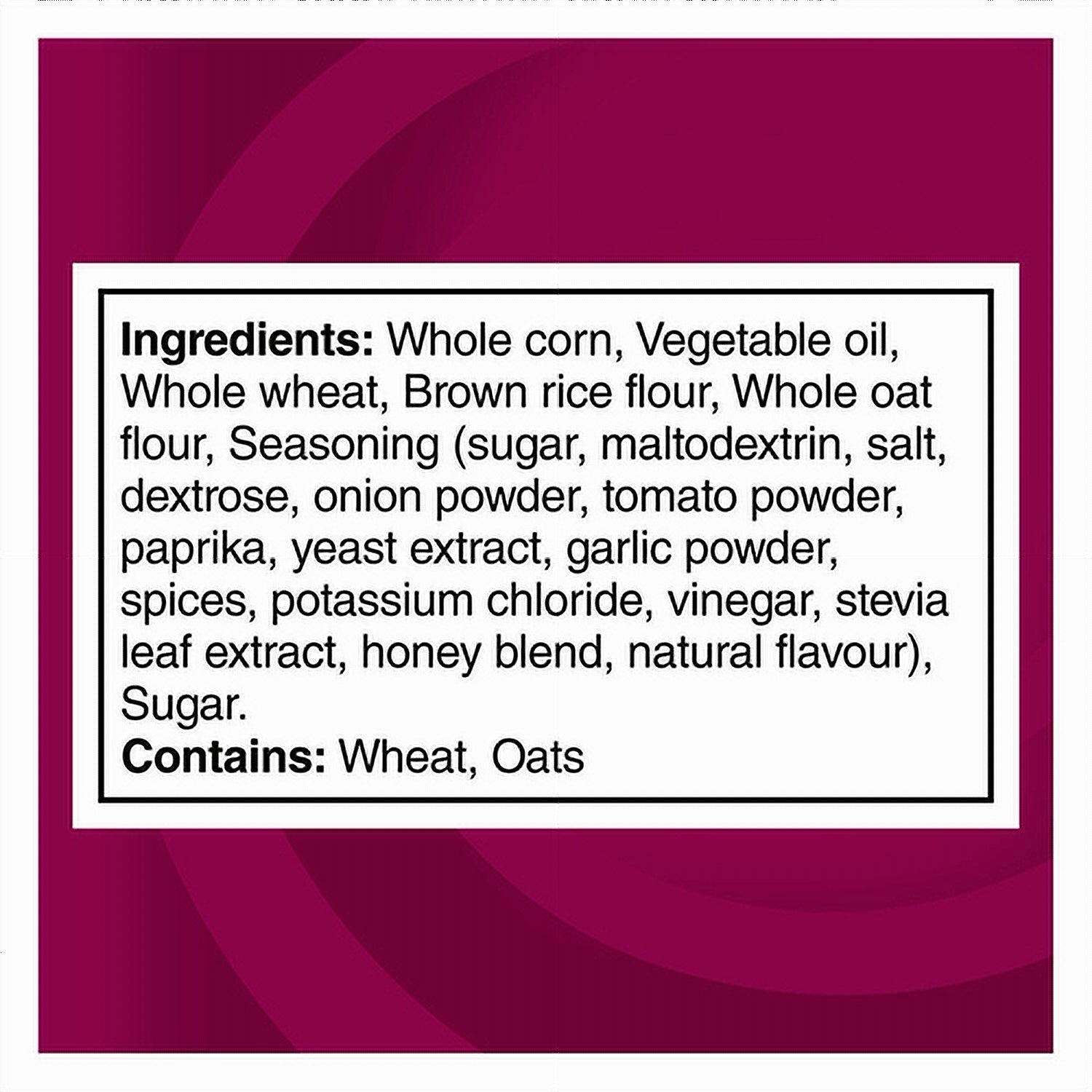 IngredientsWhole corn, Vegetable oil, Whole wheat, Brown rice flour, Whole oat flour, Seasoning (sugar, maltodextrin, salt, dextrose, onion powder, tomato powder, paprika, yeast extract, garlic powder, spices, potassium chloride, vinegar, stevia leaf extract, honey blend, natural flavor), Sugar