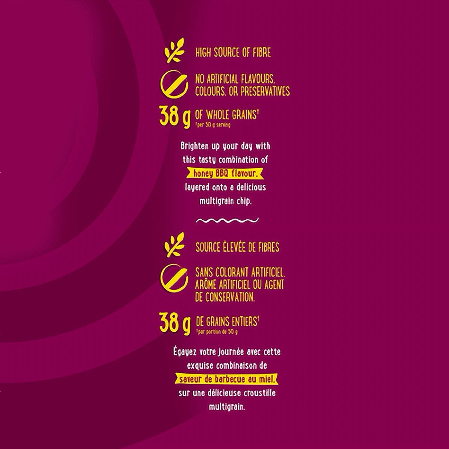 Unique wavy texture provides a hearty, satisfying crunch with every chip — bold yet balanced honey BBQ flavour that’s sweet, smoky, and impossible to put down. Sun Chips: the multigrain chip made with whole grains and crafted without compromise, made in Canada with ingredients you can feel good about.
